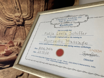 Begeistert durch die positive Wirkung, die ich bei mir selbst wahrnahm, absolvierte ich 2002 die Ayurveda Massage Ausbildung an der Five Elements Academy for Yoga and Ayurveda von Swami Shikha Jawahar in Pune, Indien.
